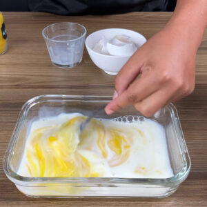 - Já em outra travessa vou colocar 2 ovos, 100 ml de leite, e vou bater para que tudo se misture.