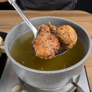 - Para finalizar vou colocar as coxas em uma panela com óleo fervente e deixar fritar bem.