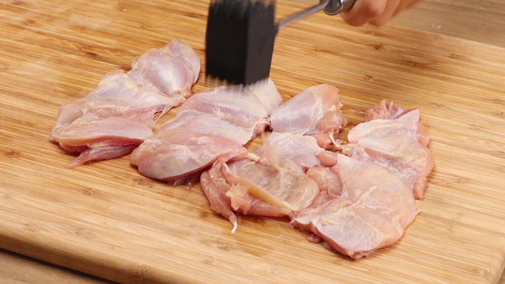 - Para esta receita vamos precisar de 5 coxas de frango. Vou retirar toda a carne dos ossos. Agora vou passar essa carne para uma tábua, e vou bater com ajuda de um martelo para que fique bem macia.