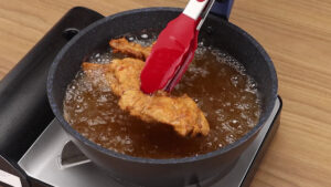 - Depois em uma frigideira vou adicionar óleo. E quando esse óleo estiver bem quente vou colocar o frango. Quando estiver frito vou retirar e escorrer todo o óleo. Vou repetir esse processo como restante do frango.