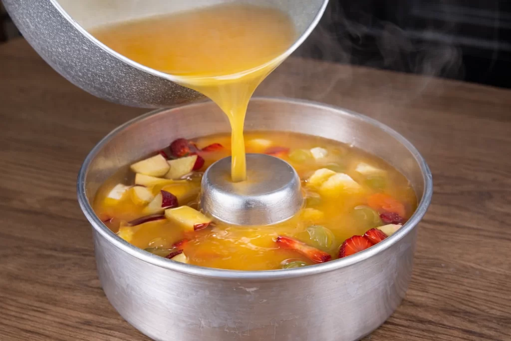 - Lege alle geschnittenen Früchte in die Form und verteile sie gleichmäßig.