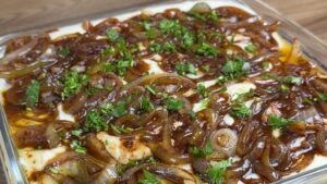 • Arrume os bifes em uma forma, cubra com o molho preparado e as cebolas caramelizadas.