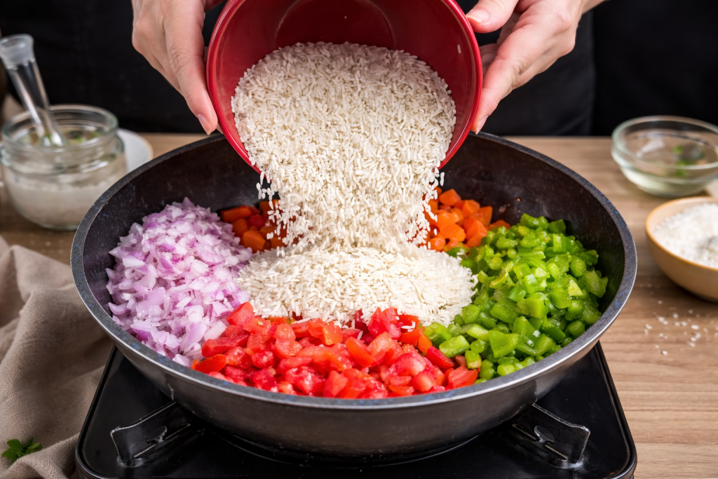 - Add the uncooked rice and minced garlic. Season with salt and paprika, then add the oil. Mix everything well to combine.