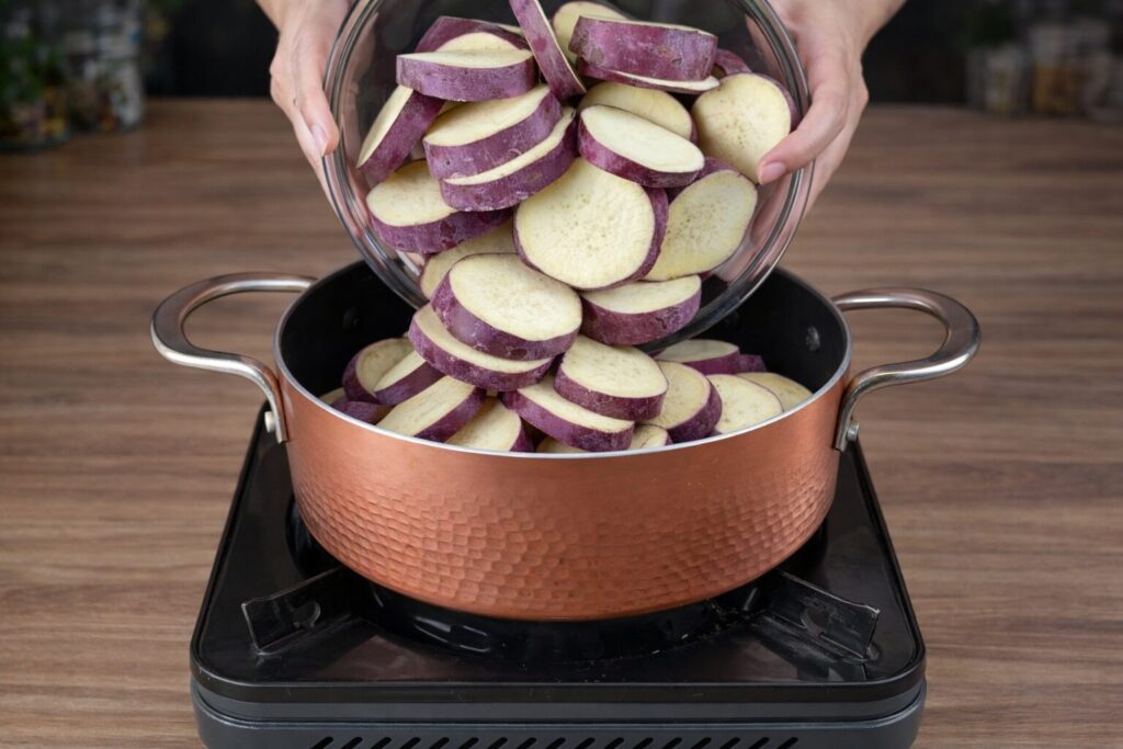 - Slice the sweet potato and cook it in a pot with water until it becomes very soft.