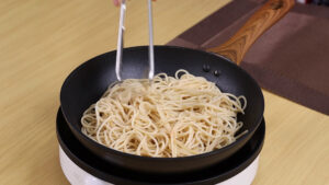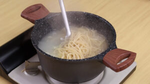 - Emuma panela em fogo médio vou adicionar 1 litro de água quente, 2 colheres de sopa de óleo, 1 colher de chá de sal e 200 g de macarrão espaguete, vou deixar cozinhar por 7 minutos. Passado esse tempo vou desligar o fogo e escorrer toda a água.