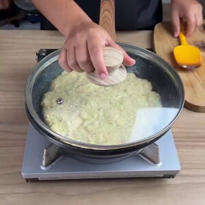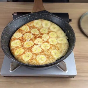 • Por fim, adiciono as bananas cortadas em uma frigideira já com óleo, vou despejar a banana com os ovos na frigideira e vou deixar fritar por 10 minutos cada lado.