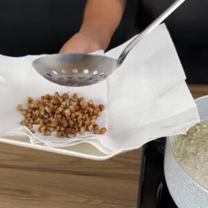 • Para começar, adiciono em uma panela com óleo já quente feijão cozinhado a gosto e vou deixar fritar por 2 minutos. Em seguida, vou escorrer o óleo e transferir para uma tigela.
