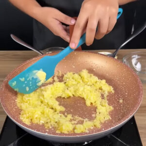 • Depois numa frigideira adiciono 1 colher de margarina, 1 cebola picada, 1 colher de alho picado, vou misturar bem e deixar fritar rapidinho.