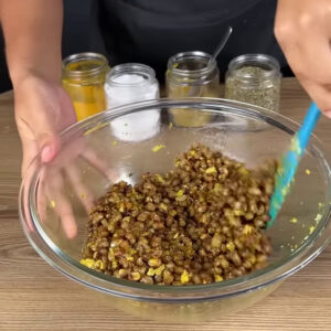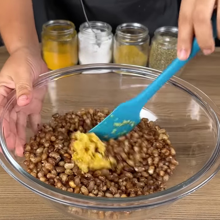 • Por fim, adiciono 1⁄2 colher de sal, 1⁄2 colher de açafrão, 1⁄2 colher de curry e 1 colher de orégano. Agora vou misturar novamente.