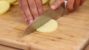 • Para começar vou cortar 3 batatas em pedaços pequenos.