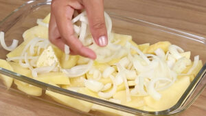 • Agora vou cortar 1 cebola em rodelas, e adicionar por cima das batatas.