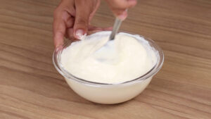 • Para continuar em uma tigela vou adicionar 200 gramas de creme de leite, 2 colheres de sopa de maionese e misturar.