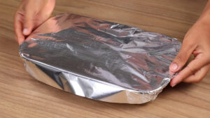 • Depois vou cobrir com papel alumínio e levar ao forno a 180 graus por 40 minutos.