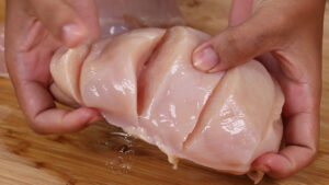 • Para a nossa receita nós vamos precisar de 2 peitos de frango, irei fazer cortes nesse peito da maneira que estou mostrando.