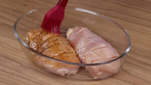 • Passarei todo o nosso frango para dentro de uma travessa e com um pincel vou pincelar toda a nossa mistura de temperos por cima.