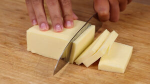 • Nós vamos precisar de queijo muçarela, cortarei algumas fatias.