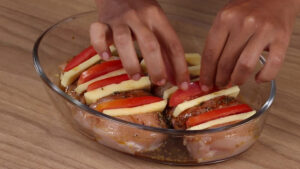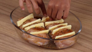 • Irei colocar essas fatias dentro dos cortes que fizemos nos peitos.