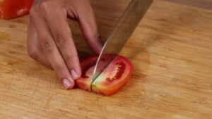 • Aqui eu tenho 1 tomate cortarei esses tomates em fatias e depois cortarei cada fatia ao meio.