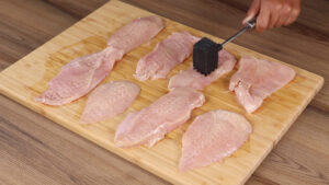 - Para começar vou cortar 3 filés de peito de frango em fatias. Vou bater bem com ajuda de um martelo para ficar macio.