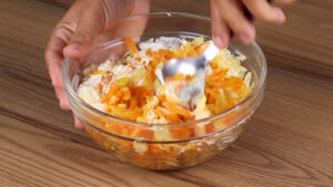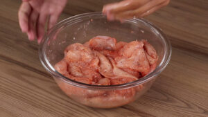 - Vou passar para um recipiente e temperar com 2 colheres de chá de sal, 1 colher de chá de páprica,1 colher de chá de pimenta do reino 1 colher de chá de alho em pó e misturar para que esses temperos se agreguem bem.