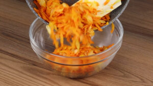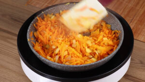 - Agora em uma frigideira vou adicionar 1 fio de azeite, 1 cebola picada, 1 cenoura ralada e vou refogar bem.