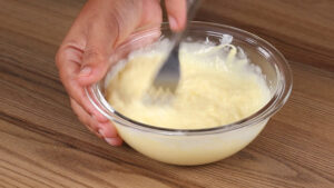 - Vou adicionar 1 xícara de queijo muçarela, 2 colheres de sopa de requeijão, alho em pó a gosto, sal a gosto e vou mexer.
