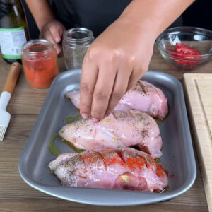 - Para começar, em três peitos de frango adiciono sal, pimenta do reino, manteiga e tomate cortados em meia-lua, queijo muçarela, vou fechar o frango e fazer cortes sem apartar.
