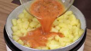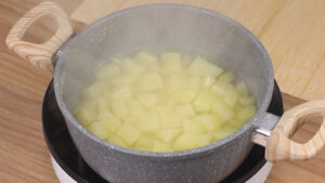 - Em uma panela vou adicionar 600 g de batatas cortadas em cubos para cozinhar, quando essas batatas estiverem cozidas vou escorrer toda a água.