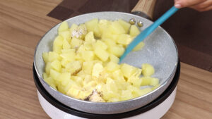 - Agora em uma frigideira em fogo médio vou adicionar toda as batatas cozidas, 2 colheres de sopa de margarina, 1 colher de sopa de óleo, 1 pitada de sal, 1pitada de pimenta do reino e vou refogar bem.