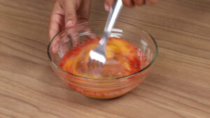 - Enquanto isso em uma tigela vou adicionar 3 ovos, 1 colher de chá pimenta do reino, 1 colher de chá de sal, 1 colher de chá de orégano, 1 colher de chá de corante, 2 colheres de sopa de leite e vou misturar bem.