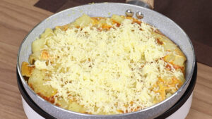 - Tamparei a frigideira e deixarei cozinhar em fogo baixo por 15 minutos. Passado esse tempo vou destampar a e virar para cozinhar o outro lado e colocarei queijo por cima, que é opcional.