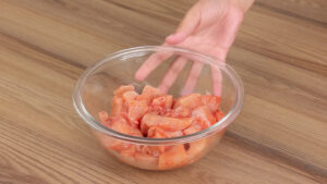 - Em seguida vou adicionar o frango em uma tigela, vou temperar com ½ colher de chá de pimenta do reino, 1 colher de chá de sal, 1 colher de chá de páprica, e vou misturar bem.