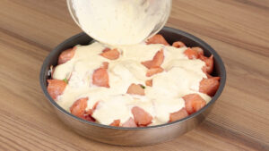 - Após isso em uma forma assadeira vou adicionar as cebolas, as batatas, o bacon, cebolinha a gosto, ½ colher de chá de pimenta do reino, ½ colher de chá de sal, 20 ml de azeite, o frango e a mistura de creme de leite. Vou cobrir com papel alumínio e levar ao forno a 180 graus por 20 minutos.