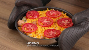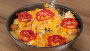 - Passado esse tempo vou retirar do forno, adicionar 100 gramas de queijo cheddar ralado, as rodelas de tomate, e vou levar ao forno a 180 graus por mais 10 minutos.