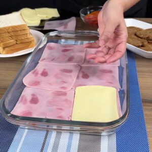- Depois vou cobrir fazendo uma camada com presunto, em seguida faço outra camada com queijo.