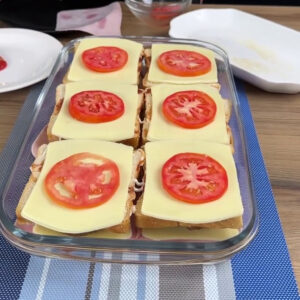 - Agora vou adicionar tomate cortado em rodelas, em seguida adiciono carne de hambúrguer, depois uma camada de pão novamente, adiciono maionese, ketchup e vou repetir o processo novamente.