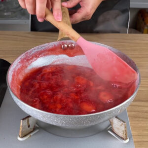 • Agora em uma frigideira no fogo médio vou adicionar os morangos cortados, o açúcar e vou mexer bem sem parar até virar uma calda. Reservarei em seguida.