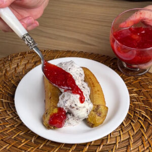 • Depois vou colocar as bananas fritas em um prato, colocarei também algumas bolas de sorvete e por cima disso tudo a nossa geleia feita na frigideira.
