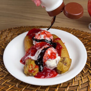 • Vou finalizar colocando calda de chocolate. E o nosso lanche delicioso com banana, sorvete e chocolate está pronto e ficou uma maravilha!