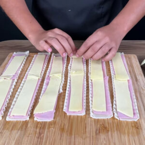 • Para começar, vou colocar fatias de presunto em cima do macarrão de Lasanha cozido, queijo muçarela e enrolar.