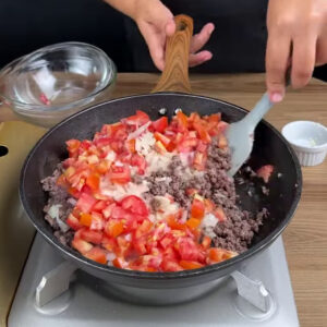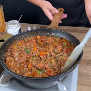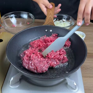 • Numa frigideira vou adicionar 300g de carne moída e refogar.