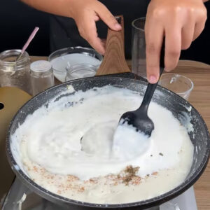 • Em outra frigideira coloco 1 cebola picada, 1 colher de farinha de trigo, 1 xícara de leite, vou mexer rapidinho. Em seguida, adiciono 1 colher de sal, noz moscada, 1⁄2 colhe de pimenta do reino, 200g de creme de leite e vou mexer bem.
