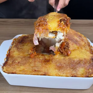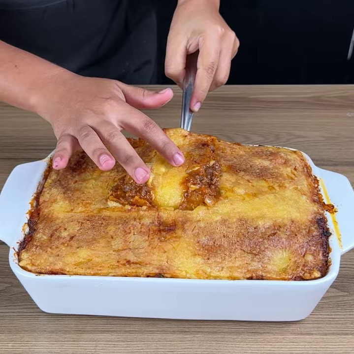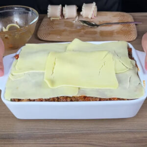 • Vou colocar todo o molho numa forma , vou adicionar os enroladinhos de macarrão, a carne temperada e por fim fatias de queijo muçarela.