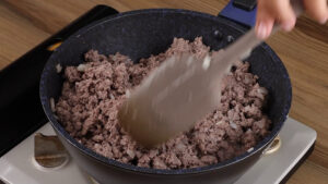 - Para começar, em uma frigideira vou adicionar óleo, ½ cebola picada, 1 kg de carne moída, 1 colher de chá de sal, ½ colher de chá de pimenta do reino e vou mexer até que essa carne esteja frita.