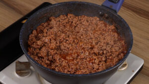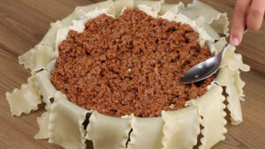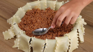 - Vou adicionar mais carne. E mais queijo muçarela. Depois vou fechar tudo isso com a massa e levar ao forno a 180 graus por 45 minutos.