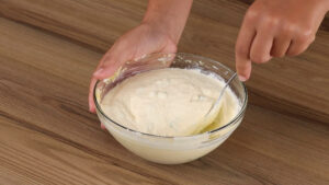 - Para continuar, em uma tigela vou adicionar 425 gramas de requeijão, cheiro verde a gosto, 1 ovo, ½ xícara de queijo parmesão ralado e vou misturar bem.