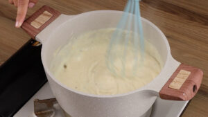 - Enquanto isso, em uma panela vou adicionar 1 colher de sopa de manteiga, 2 colheres de sopa de farinha de trigo e vou mexer. Vou adicionar também 1 xícara e ½ de leite e vou mexer até virar uma mistura homogênea.