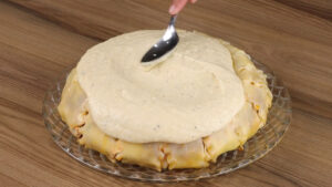 - Agora vou virar a nossa lasanha. E por cima vou despejar o nosso molho bechamel e espalhar.