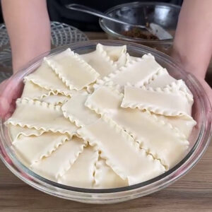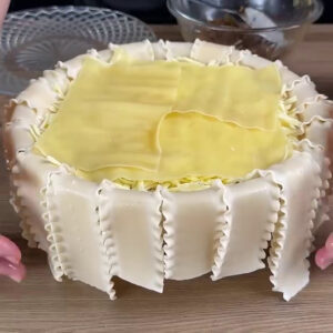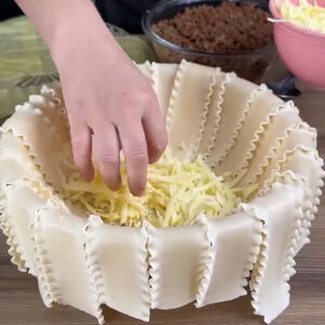 - Para começar, numa tigela com massas de lasanha cozida nas bordas, vou adicionar queijo.