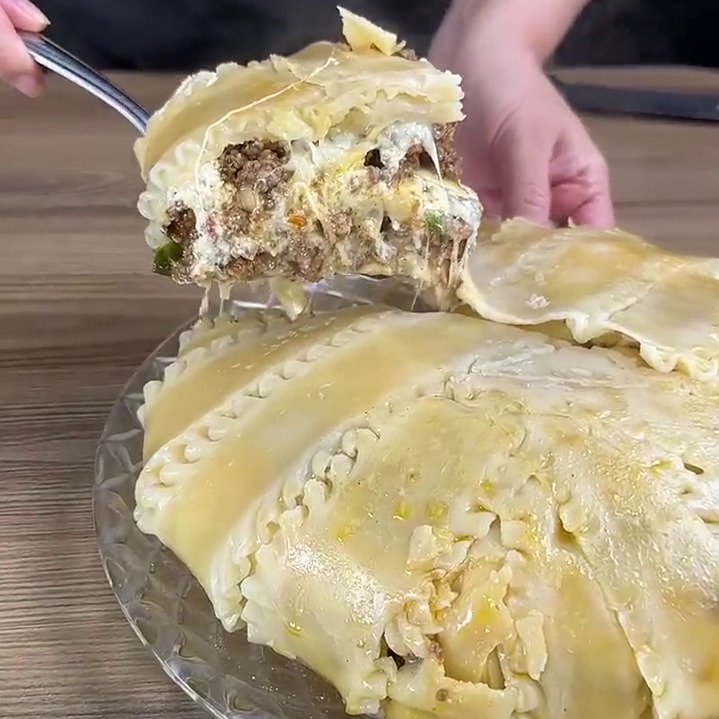- carne moída cozida, cobrir com fatias de macarrão, molho branco, mais queijo e carne, molho branco, mais queijo ralado, mais fatias de macarrão.